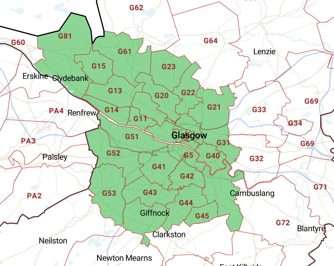 AnnieslandBailliestonBishopbriggsBroomhillCambuslangCardonaldCastlemilkDennistounDrumchapelEasterhouseGiffnockGlasgow City CentreGovanHillheadIbroxMaryhillMount FloridaPartickPollokRutherglenShettlestonSpringburnSteppsThornliebankToryglenWhiteinchYoker